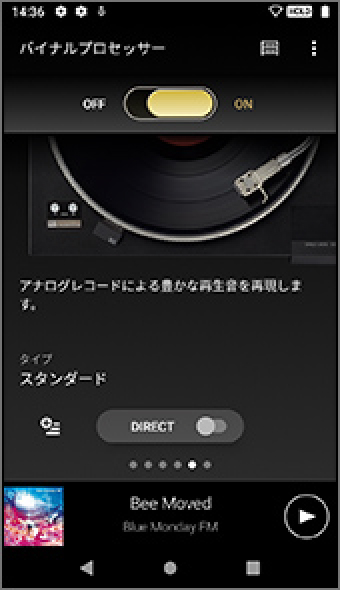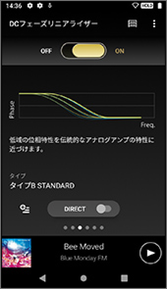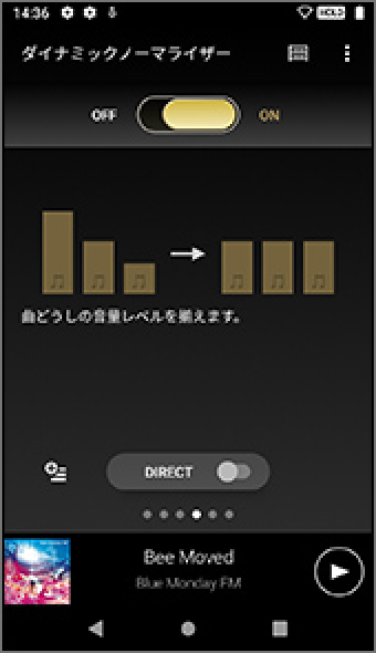 音楽再生画面を中心に上下左右にスライドすることで、各メニュー(ライブラリートップ/再生リスト/お気に入り/各種音質設定)に素早くアクセスが可能です。
