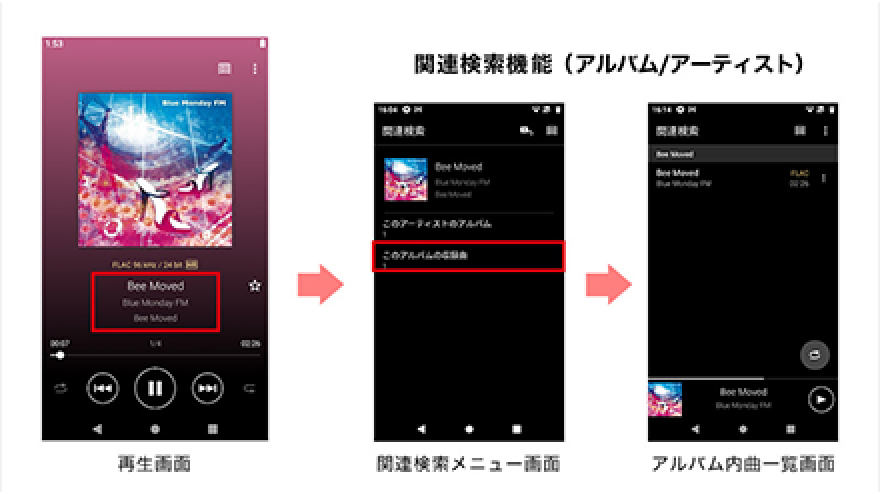 再生画面の曲名の部分をタップすると、再生中の曲のアルバムから収録曲を探す「アルバム関連検索」と、再生中の曲のアーティストからアルバムを探す「アーティスト関連検索」を利用できます。関連する楽曲をすぐに見つけられて便利です。
