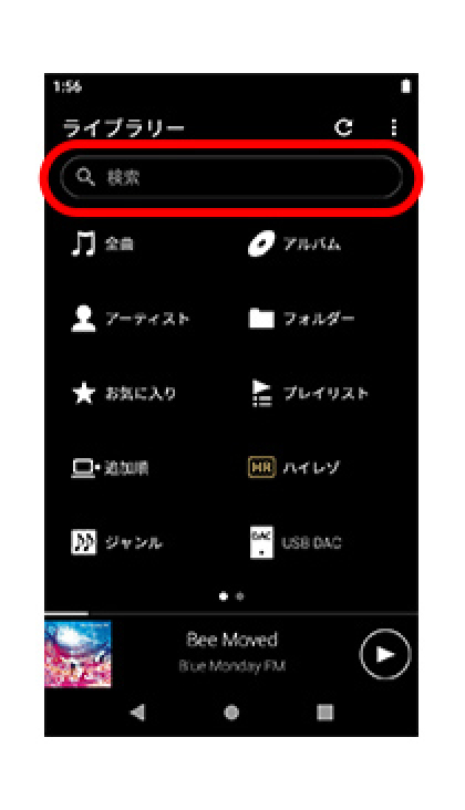 ライブラリートップの「検索キーワード入力BOX」に、キーワードを入力すると、曲/アルバム/アーティストから該当するものを検索できます。聴きたい楽曲がすぐに見つかり、とても便利です。