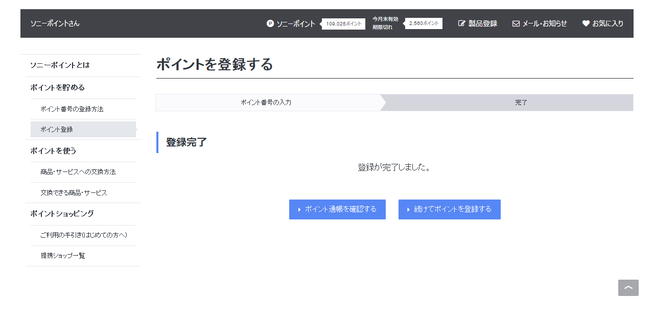 登録できているかを確認する場合は、「ポイント通帳を確認する」ボタンをクリックしご確認ください。