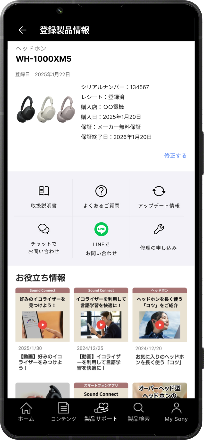 My Sonyアプリでレシートを登録することで、修理のお申し込みがかんたんにできます*2。チャット相談などサポート機能も充実。