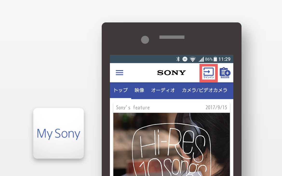 上記アイコンよりMy Sonyアプリを開き、「サインイン」よりMy Sony IDでサインインしてください。