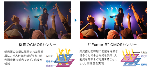 ソニー独自の「“Exmor R” CMOSセンサー」を搭載。配線層をフォトダイオード(受光素子)の裏側に配置させた裏面照射型構造により、入射光を効率よく利用することで繊細な感度を実現。スタジオやステージなど室内の暗い場所でもノイズを抑えてくっきりと高画質で表情や動きを再現します。
