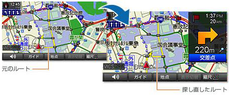 ルートを外れた場合、自動的に新しいルートを探索してルートガイドを続けます。