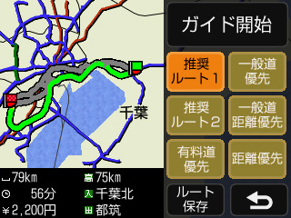 ルート探索条件を、「推奨ルート1」、「推奨ルート2」、「有料道優先」、「一般道優先」、「一般道距離優先」、「距離優先」から選んで設定可能。また、経由地を最大10カ所まで設定できます。