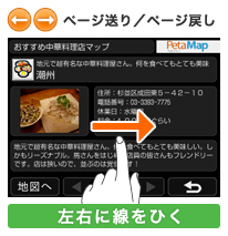 ガイドブックのスポット詳細画面表示中、左から右に線を引けば、次のページに進みます。右から左に線を引けば、前のページに戻ります。