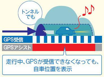 走行中にトンネルに入ったときなど、一時的にGPS電波を受信できなくなっても、短時間であれば進行方向やスピードから自車位置を予測して表示します。