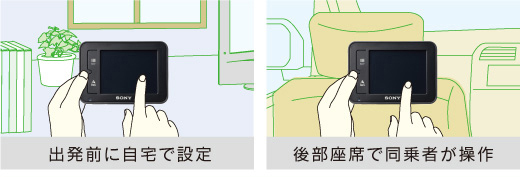 バッテリー内蔵だから、ドライブ前に家で目的地を設定でき、クルマに乗りこんですぐに出発できます。また後部座席の人が手元で操作することもできて便利です。