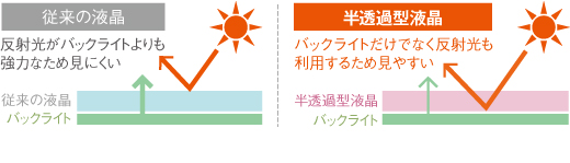 太陽光を取り入れられる半透過型液晶を採用。昼間の屋外でも見やすさをアップしました。また、バックライトを最低輝度にしても反射光を利用できるため、バイク、サイクリング、徒歩、アウトドアなど屋外で使用してもバッテリーが長持ちします。