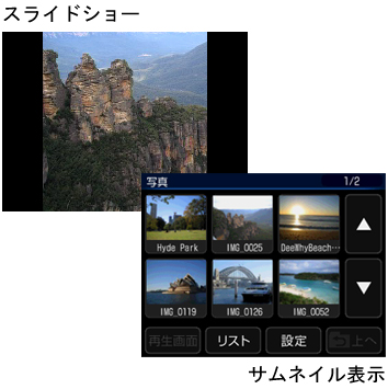 音楽・ビデオ再生時に画面にタッチすれば、再生が一時停止。もう一度画面にタッチすれば、停止した位置から再生が再開されます。写真閲覧時には、画像再生の送り/戻しや、スライドショーの開始/一時停止ができます。