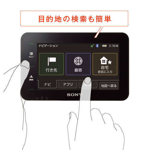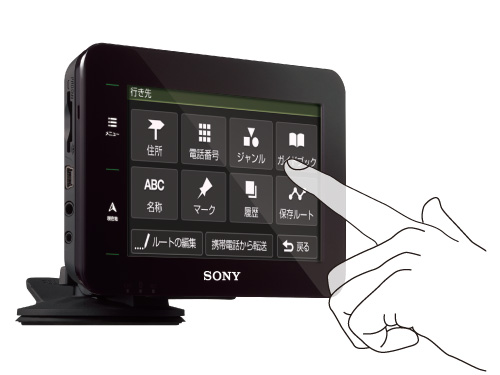 画面上のボタンをタッチすることで、簡単に行先を検索して目的地に設定できます。すべての操作がタッチパネルなので、機械操作が苦手な方でも使いこなせます。