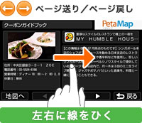 ガイドブックのスポット詳細画面表示中、左から右に線を引けば、次のページに進みます。右から左に線を引けば、前のページに戻ります。