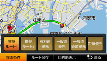 推奨ルートや有料道優先、一般道優先など、目的地までの6種類のルートを探索できます。