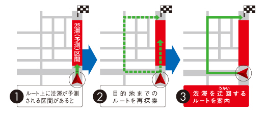 別売のVICSビーコンユニット(NVA-VB8)を接続すれば、目的地へのルート上にある渋滞情報をキャッチ。自動的に別のルートを探し、渋滞を迂回するルートに変更します。