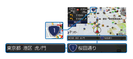 地図上に、路線番号を表示。また、走行中の道路名や住所も表示も可能です。