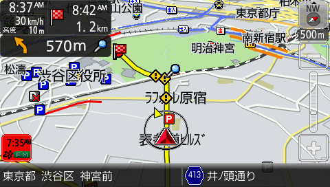 推奨ルートや有料道路優先、一般道優先など、目的地までの6種類のルートを探索できます。