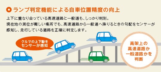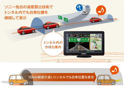 トンネルや高架下、ビルや山の陰などで、走行中にGPS電波が受信できない状況が10km程度続いても、自車位置をより正確に表示し、右左折・分岐案内、音声ガイドを継続します。