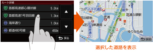 地図上に、路線番号を表示。また、走行中の道路名や住所も表示が可能です。