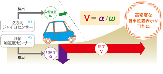「POSITION plus GT」は、2方向のジャイロセンサー(*1)に加え、3軸の加速度センサー(*2)を搭載。これらのセンサー情報から、ソニー独自の算出技術により、路面のわずかなうねり(勾配)を利用してリアルタイムでの走行速度を算出できるようになりました。この技術により、従来の加速度情報による速度算出方式と比較して、GPS情報を受信できない場合の自車位置測位の精度が飛躍的に向上しました。
