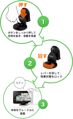 ダッシュボードに「ピタッと吸盤」をピタッと取り付け。空気を抜いてロックする機構により、しっかり取り付け可能です。あとは、本体をカチッとクレードルに装着すれば、シガー電源コードの接続だけで他の配線は不要です。