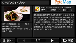 「グルメぴあ」「ぴあ こどもと遊ぼう」「全国立ち寄り温泉」「サイクリングターミナル」といったガイドブック情報を豊富に収録。それらの写真や詳細情報を見て、行きたい場所を探し、そのまま目的地として設定できます。情報は、地図情報サイト「PetaMap(ペタマップ)」を利用して更新・追加が可能。「グルメぴあ」や「FooMoo」のお得なクーポンのダウンロードもできます。