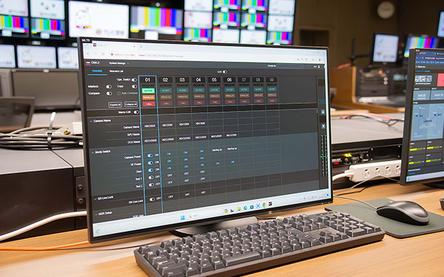 今回はハードウェアのマスターセットアップユニット(MSU)に代えて、カメラコントロールネットワークアダプター『CNA-2』とWeb MSUライセンス『HZC-MSUCN2』を導入しました。Web MSUは、同一カメラネットワーク上のWebブラウザ経由で、システム内のカメラシステム全体を統合監視・遠隔制御ができるアプリケーションで、サブ内のどこからでもアクセスして、カメラオペレーションができる点が大変便利です。今回、VE卓をサブ内の最前列に配置し、2列目の操作卓は、番組の特性に応じて任意の作業ができるスペースにしています。KVMスイッチにより、どの卓でもどの作業でも行うことができますので、VE卓にオペレーターがいる場合でも、2列目の操作卓からWeb MSUにアクセスし、VEオペレーションのフォローをすることもできるようになりました。これはハードウェアタイプのMSUでは実現できなかった柔軟なオペレーションで。まさに「どこからでも機器にアクセスできる」というIPシステムの魅力ですね。