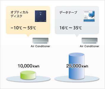 オプティカルディスク・アーカイブメディアは、温度・湿度条件に優れ、保存の為の特別なコンディション管理が必要ない為、エネルギーの消費を抑え、CO2削減にもつながります。