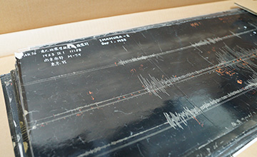 地震計による記録では、古くは「すす書き記録」を行っておりました。極めて細く記録できることから、紙媒体よりも鮮明に目視できる反面、劣化が起こりやすく、すすが剥げてしまうため、保管には気を使います。朽ち果てる前に、電子化していかなければなりません。