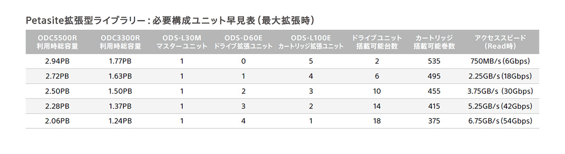 拡張ユニットは、最大4台のドライブユニットとアーカイブカートリッジを61巻搭載可能な「ODS-L60E」、アーカイブカートリッジを最大101巻搭載可能な「ODS-L100E」の2モデルを選択いただけます。マスターユニットと合わせて最大6ユニットまで連結可能です。
