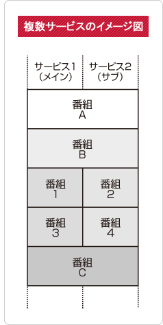 右図のような場合に、番組2や4を録画予約するには、サービス2(サブ)側の番組を受信したのち、取扱説明書(24ページ)を参照の上、該当する番組説明を表示して、録画予約の操作をしてください。
