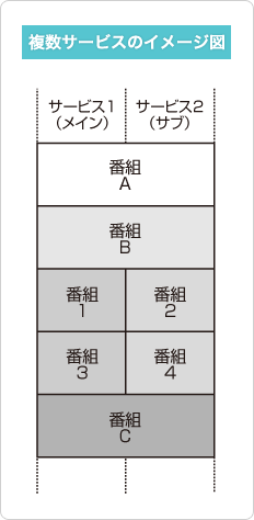複数サービス受信時では、番組が複数に分かれている場合や分かれていない場合にかかわらず、各サービスの番組表を表示することができます。