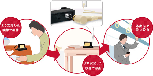 充電スタンドにテレビアンテナ端子を装備(*2)。電波の届きにくい部屋の中でも途切れや乱れの少ない安定した映像で視聴や録画が可能。録った番組を外出先で好きな時間に楽しめます。