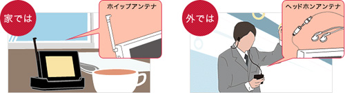 本体に収納できるホイップアンテナに加え、ヘッドホンアンテナも付属。スピーカーで音を出して視聴するときはホイップアンテナ、電車の中などではヘッドホンアンテナと使い分けられます。
