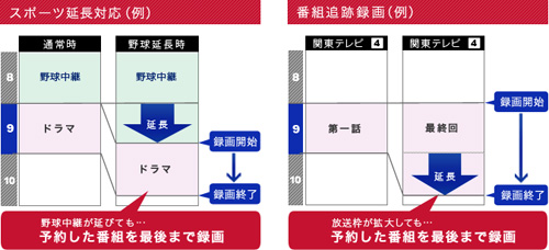 「野球中継が延びて、楽しみにしていたドラマが半分しか録れていない」、「連続ドラマの放送時間枠の変更を知らなかったために、肝心のラストシーンが録れていない」という録画の失敗を自動的に防止。