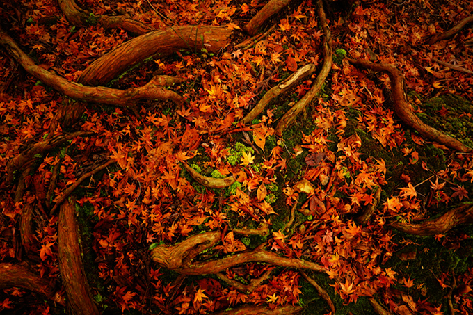 木の根がたくましく伸びていて、苔むした地面ともみじの紅が美しい1枚です。これは毘沙門堂の境内の裏、人があまり足を運ばない場所での撮影。