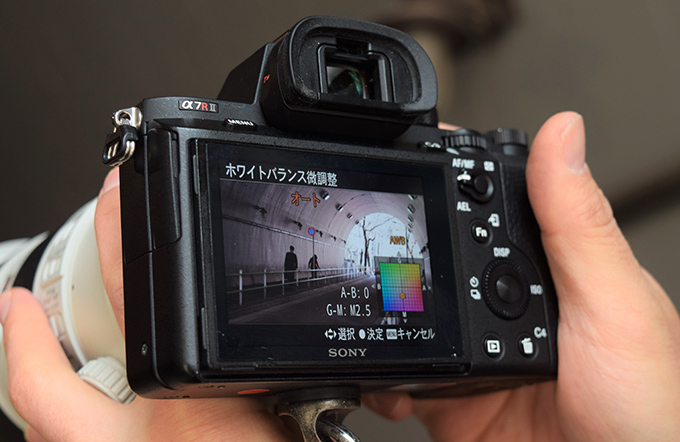 αシリーズは液晶モニターで確認しながら撮影できるので、その場で色味の調整もできるのが便利。「その場で色味を調整しておかないと、桜本来の色を忘れてしまいます。」と別所さん。その場の光との相対的な感覚で調整しますが、この時はホワイトバランスをマゼンタ寄りに(右と下に2目盛りずつ)調整しています。