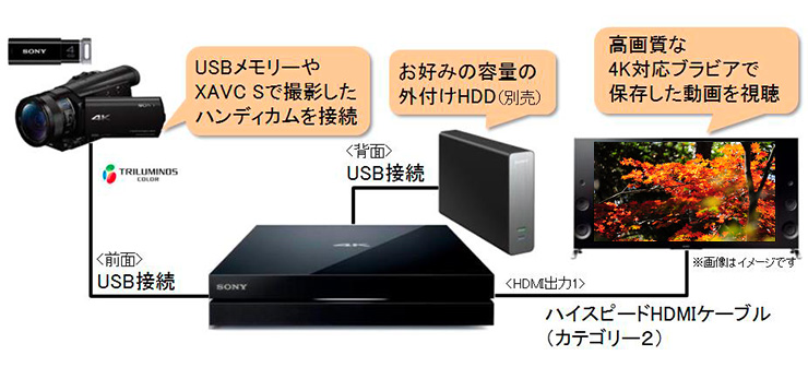 4Kハンディカムを4Kメディアプレイヤー本機前面のUSB端子に接続することで、