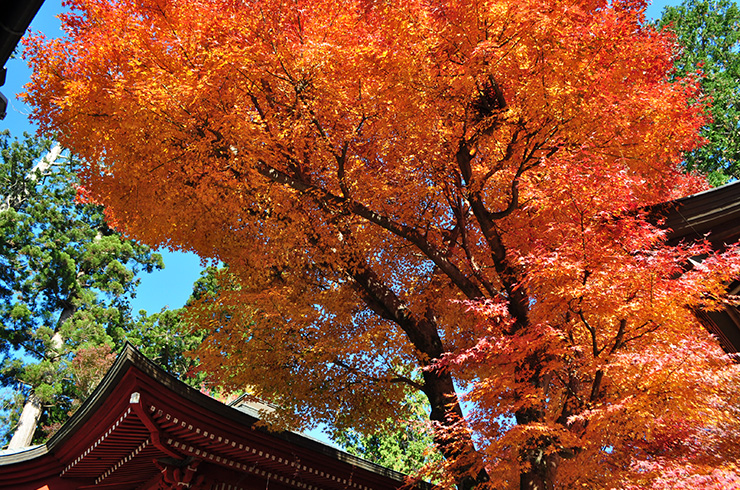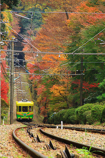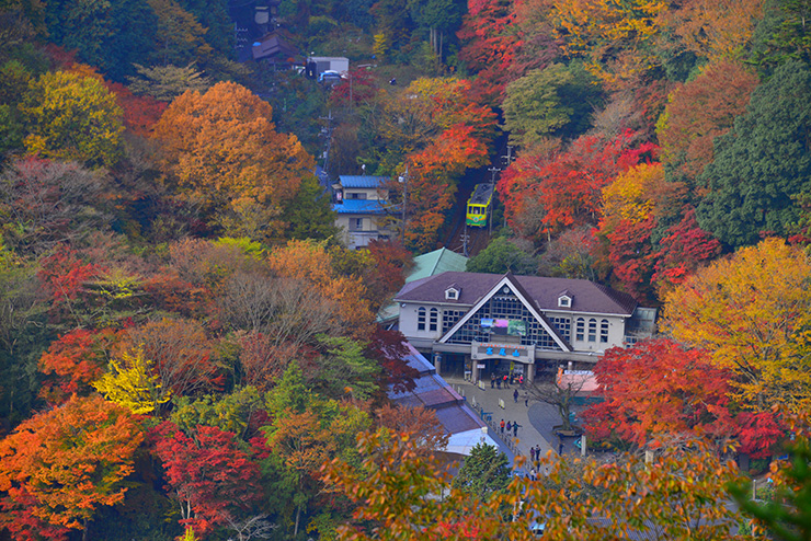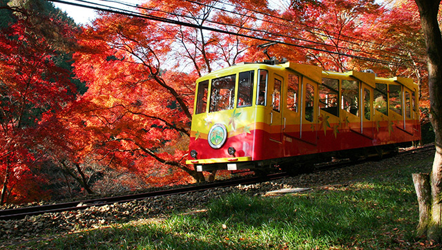 紅葉の見ごろを迎えるとケーブルカーの左右に真っ赤な紅葉のカーテンが広がる。