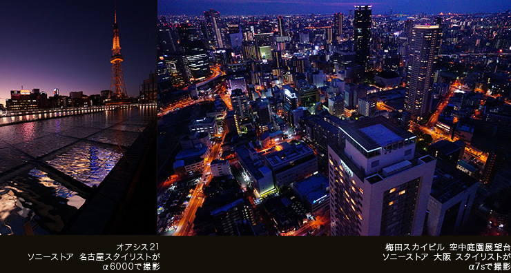 ここまでは東京の夜景を紹介してきたが、名古屋・大阪の夜景も紹介しておこう。ソニーストア 名古屋・大阪のスタイリストがお薦めする夜景で、αユーザーのためのギャラリー&コミュニティサイト「αcafe」が企画する「α体験会」を行っている、名古屋「オアシス21」と大阪「梅田スカイビル 空中庭園展望台」からの夜景の見どころを丸々氏に伺った。