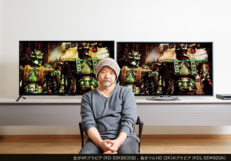 今回は特別に、ディテールにまで徹底的にこだわり、芸術性を極限まで高めていることで世界に知られるクリエーター、押井守監督にお話を伺った。視聴した作品は、押井監督が手がけた映画で、2月28日にWOWOWでオンエアーされる『GHOST IN THE SHELL / 攻殻機動隊』(1995年)と『イノセンス』(2004年)の2作。この2作に加えて、押井監督の最新作『GARM WARS The Last Druid』を、フルHDの(2K)ブラビア(KDL-55W920A)と4Kブラビア (KD-55X8500B)の2台を並べて、アップコンバートの実力を見比べていただいた。
