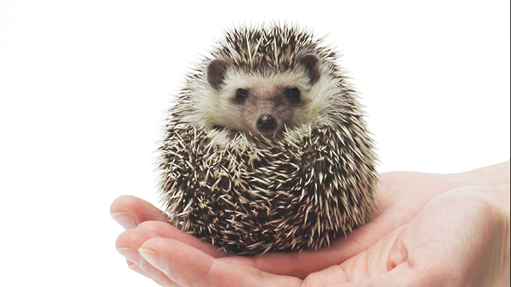 今、ハリネズミの毛は、細かく震えていますね。『大丈夫かなー、大丈夫かなー』って警戒しているわけです。そして究極まで警戒すると、背中の針を外に向けて体を丸め、『いが栗』のようにボール状になります。完全な球体になる直前、顔だけ出している様子が、まるで『ダルマ』のようで、とてもかわいいでしょ? この姿がネットなどで話題になり、今、ハリネズミのブームが起きていますね。