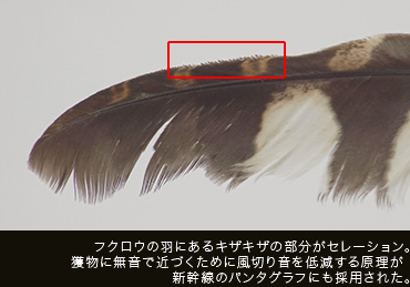 あ、これが、いわゆる「セレーション(きょ歯)」の部分じゃないかな? 羽の先端がノコギリの刃のようにギザギザになっていますよね。これがあることで、空を飛ぶ際に羽と空気が触れて音が鳴る「風切り音」が低減され、音もなく、獲物に近づくことができるそうです。今では新幹線のパンタグラフに応用され、走行時の騒音の軽減に貢献しているそうですね。