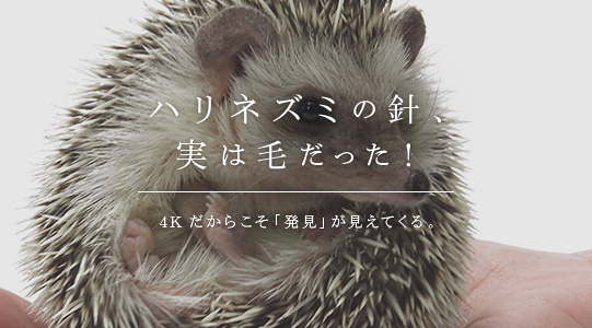 「あー、それぞれの針の一本一本が、4Kだとくっきり見えますね。ハリネズミに特徴的な、背中を覆う針の部分、これは、外敵から身を守るため、毛が針のように太く硬くなったものです」。