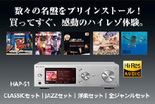 CDを超える高音質を実現したハイレゾ音源に対応したHDDオーディオプレーヤーHAP-S1に、クラシック・ジャズ・洋楽、各ジャンル選りすぐりの名盤10枚のハイレゾ音源をプリインストール。