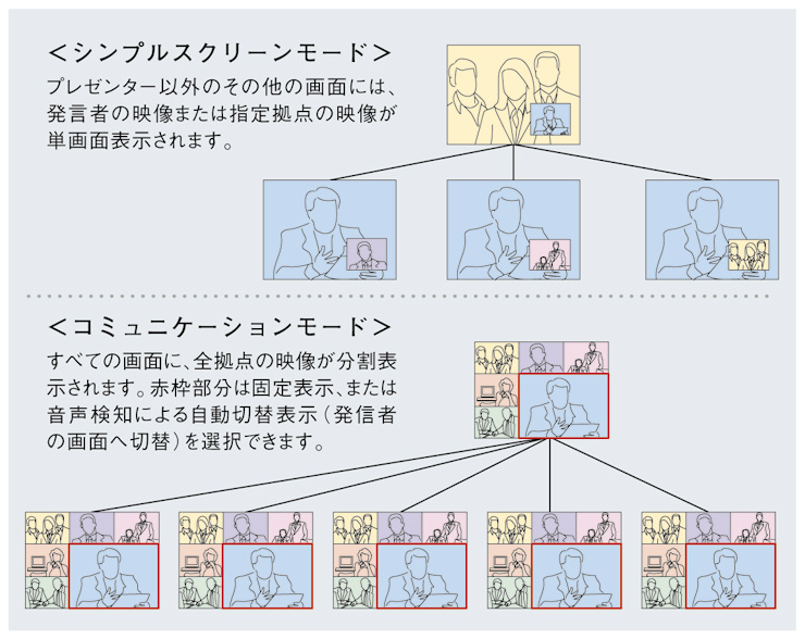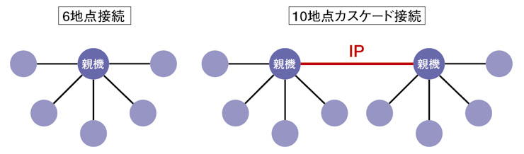 多地点接続用ソフトウェア(別売)をインストールすることで、親機になります。1台を親機とした場合、最大6地点の同時会議が行え、2台の親機をカスケード接続することで、最大10地点の同時会議が可能になります。