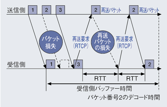 受信側が損失パケットを検出し、送信側に通知。送信側がその損失パケットをリアルタイム性を考慮して再送することによりロス回復する機能です。