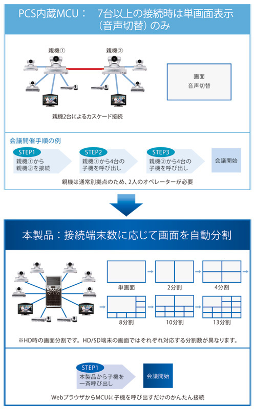 従来のPCS端末では、7台以上のビデオ会議は親機2台のカスケード接続となり、音声検知の単画面表示になるという制限がありました。