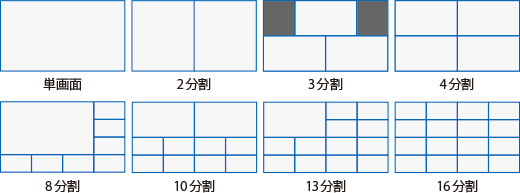 HD解像度での通信では、単画面表示と、2分割 / 3分割 / 4分割 / 8分割 / 10分割 / 13分割 / 16分割の分割画面表示から選択することができます。また、画面上の拠点名表示や話者拠点を強調表示する設定も可能です。