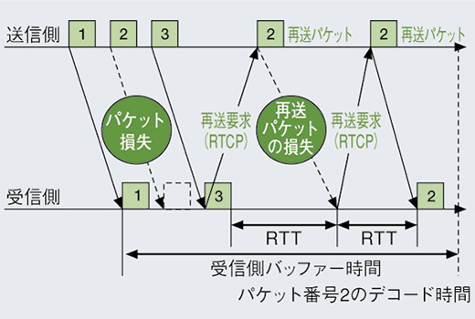 受信側が損失パケットを検出し、送信側に通知。送信側がその損失パケットをリアルタイム性を考慮して再送することによりロス回復する機能です。