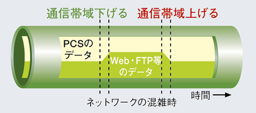 新制御アルゴリズムTFRC(TCP-Friendly Rate Control)を採用。ネットワークの混み具合に応じて通信レートを制御する機能です。WebやFTPなど他のTCPトラフィックの使用状況を考慮しながら自動調整することで、ビデオ会議をスムーズに進行できます。